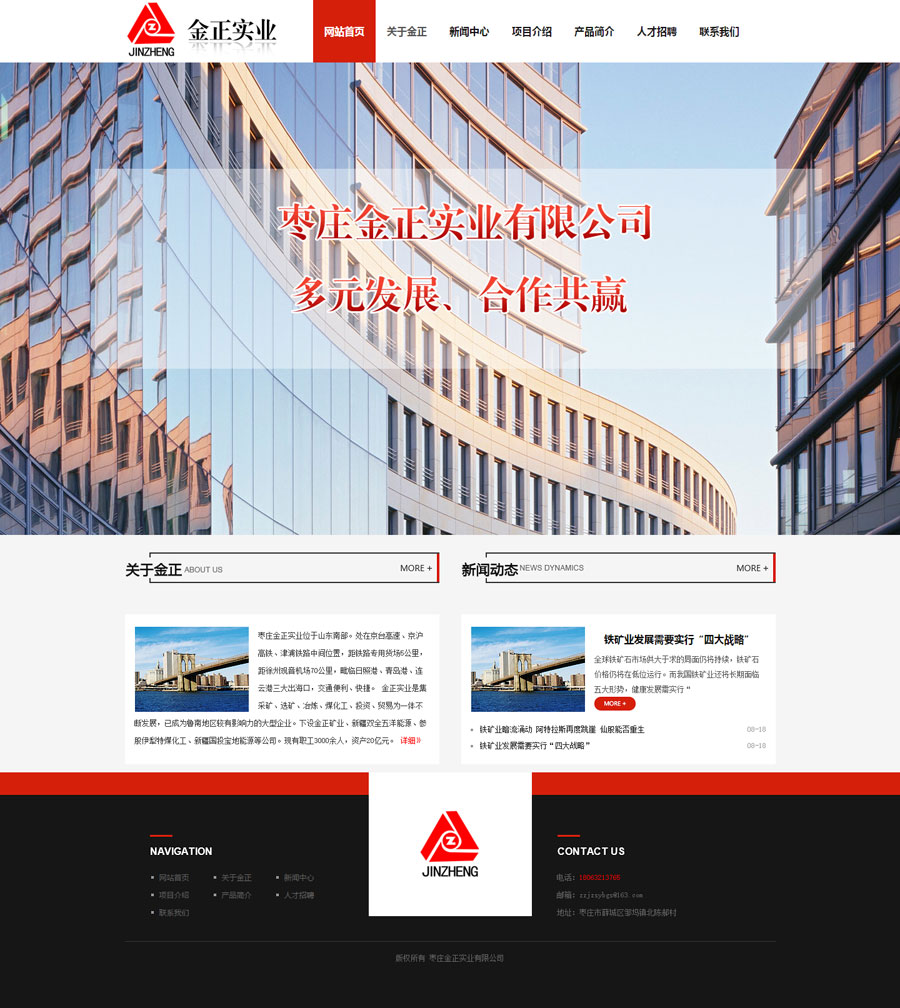 祝賀金正實(shí)業(yè)有限公司網(wǎng)站上線 公司介紹: 棗莊金正實(shí)業(yè)位于山東南部。處在京臺(tái)高速、京滬高鐵、津浦鐵路中間位置,距鐵路專用貨場(chǎng)5公里,距徐州觀音機(jī)場(chǎng)70公里,毗臨日照港、青島港、連云港三大出海口,交通便利、快捷。 金正實(shí)業(yè)是集采礦、選礦、冶煉、煤化工、投資、貿(mào)易為一體不斷發(fā)展,已成為魯南地區(qū)較有影響力的大型企業(yè)。下設(shè)金正礦業(yè)、新疆雙全五洋能源、并參股伊犁特煤化工、新疆國(guó)投寶地能源等公司。現(xiàn)有職工3000余人,資產(chǎn)20億元。先后獲得棗莊百?gòu)?qiáng)企業(yè)、突出貢獻(xiàn)企業(yè)、誠(chéng)信經(jīng)營(yíng)企業(yè)、納稅十強(qiáng)企業(yè)、山東省工會(huì)工作先進(jìn)企業(yè)等榮譽(yù)稱號(hào)。 金正礦業(yè)年產(chǎn)鐵精粉60萬(wàn)噸,金正實(shí)業(yè)年產(chǎn)鑄造用生鐵26萬(wàn)噸,主要銷往江蘇、浙江、福建、安徽、河北、山東等地,深受廣大客戶好評(píng)。 公司始終秉承“多元發(fā)展、合作共贏”的經(jīng)營(yíng)理念,遵循“精誠(chéng)團(tuán)結(jié)、銳意進(jìn)取”的企業(yè)精神。竭誠(chéng)為客戶提供優(yōu)質(zhì)的產(chǎn)品和服務(wù)。真誠(chéng)歡迎各界同仁前來(lái)指導(dǎo)、合作,我們?cè)概c您風(fēng)雨同舟、攜手共創(chuàng)美好未來(lái)。 棗莊金正實(shí)業(yè)有限公司